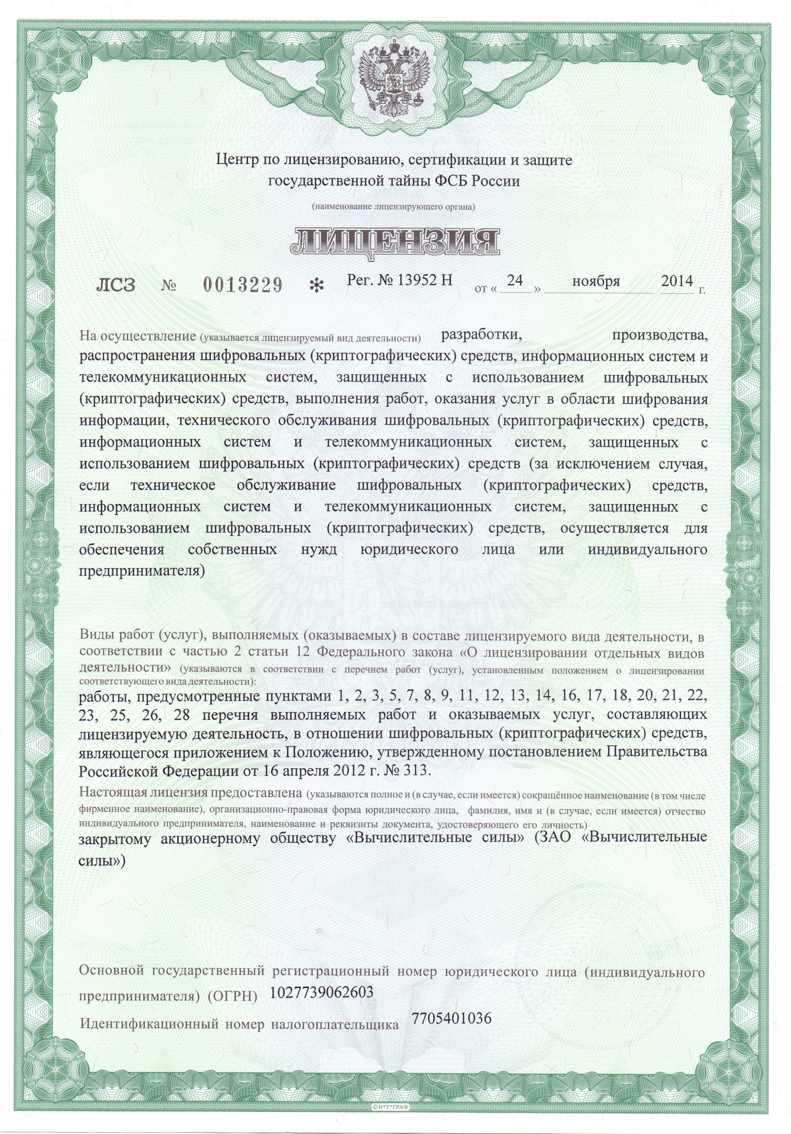 Лицензия на осуществление распрастранения, разработки, производства шифровальных (криптографических) средств, защищенных с использованием шифровальных (криптографических) средств информационных и телекоммуникационных систем.